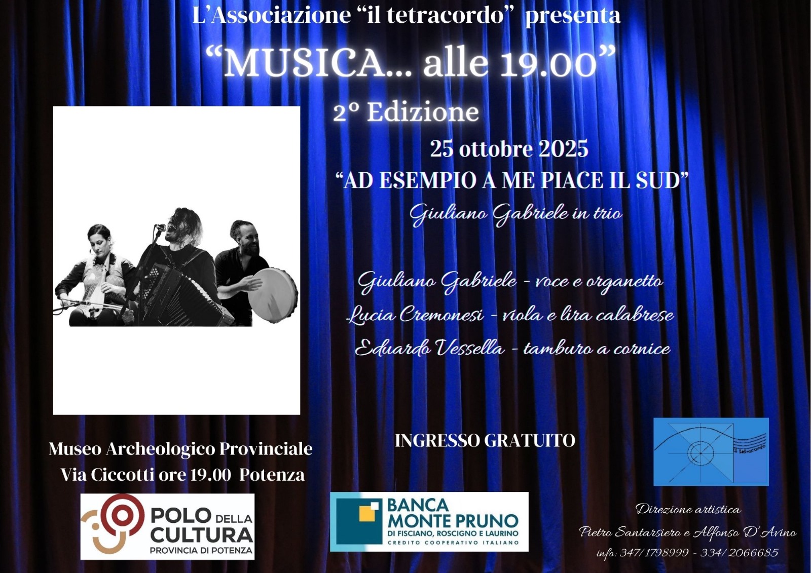 Il 25 ottobre sarà la volta di un concerto molto originale di musica etnica dal titolo “Ad esempio a me piace il Sud” con il trio formato da Giuliano Gabriele (voce e organetto), Lucia Cremonesi (viola e lira calabrese) ed Eduardo Vessella (tamburo a cornice).