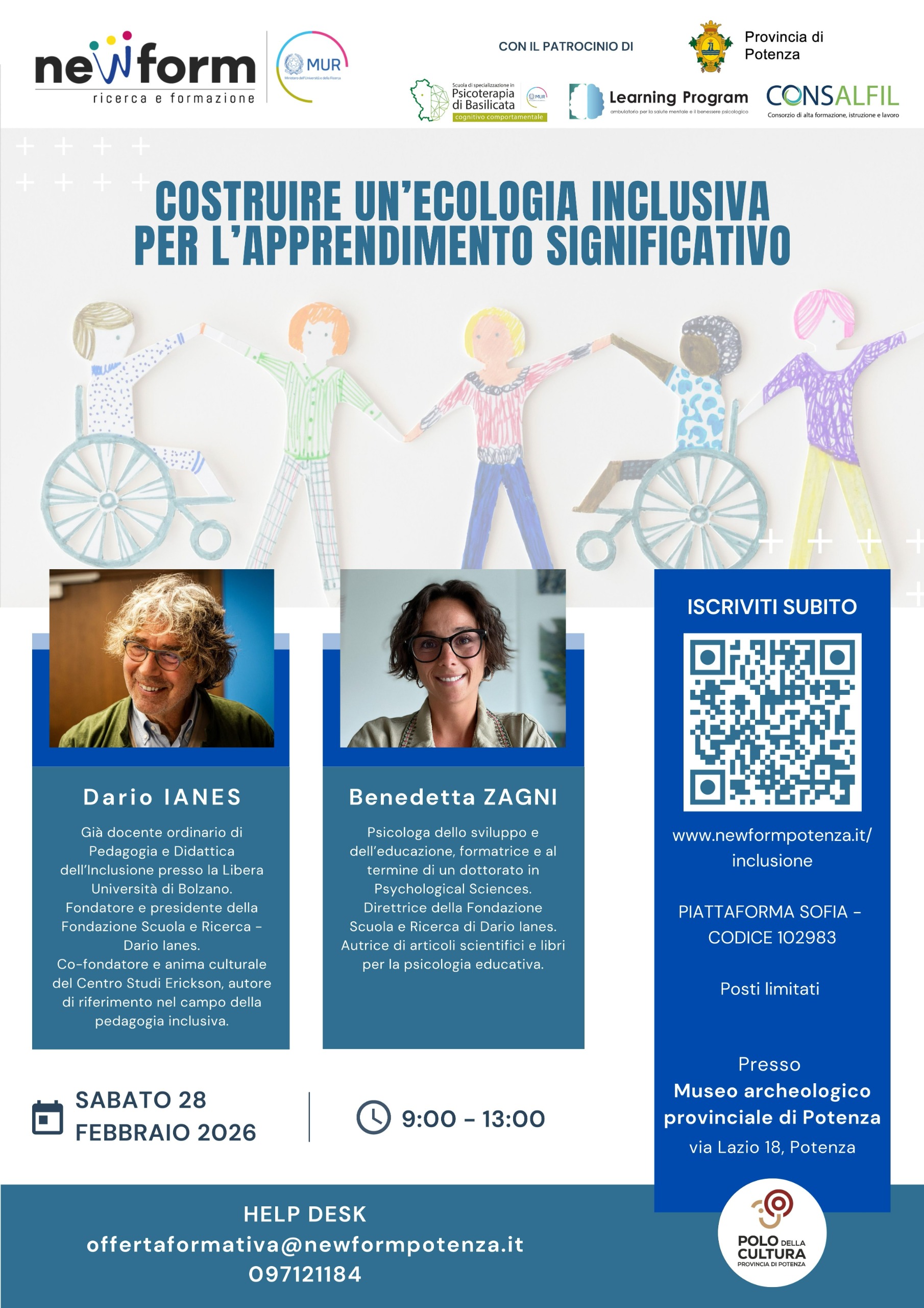 Evento formativo rivolto ai professionisti della scuola e dell'educazione per favorire la promozione della scuola come strumento di inclusività, ponendo attenzione al benessere e all'apprendimento degli studenti tutti, approfondendo tematiche come i BES (Bisogni educativi Speciali) includenti anche i DSA e le situazioni di svantaggio socio-economico, culturale e linguistico.