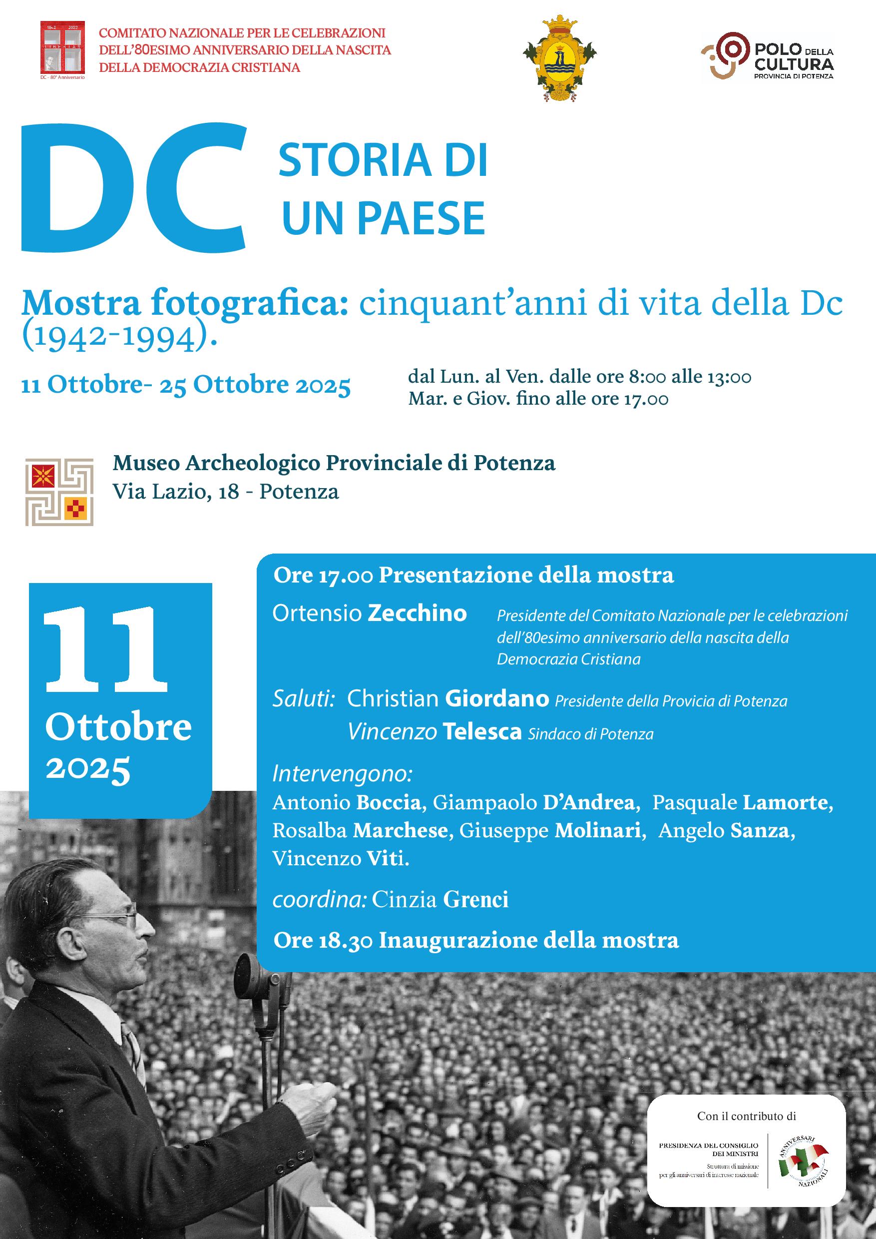 Il percorso espositivo condurrà i visitatori attraverso un’ampia selezione di immagini storiche, documenti e testimonianze, che si propone di ricostruire la storia della Democrazia Cristiana sin dalle origini, sottolineando le tappe fondamentali con cui, a partire dal tempo buio del dopoguerra, il Paese venne ancorato al mondo dell’Occidente libero e rappresentando l’impegno dei suoi protagonisti, nel promuovere ininterrottamente per cinquant’anni la cultura della democrazia. Una democrazia, per ragioni storiche incompiuta, che pur avendo inchiodato fino alla fine lo Scudo crociato alle responsabilità del potere, ha permesso al Paese di rialzarsi, di varare le grandi riforme e di continuare a crescere anche nei momenti più bui del terrorismo. L’iniziativa si inserisce nel quadro delle celebrazioni per l’80° anniversario della nascita della DC, con il sostegno della Presidenza del Consiglio dei Ministri, che ha riconosciuto l’alto valore storico e culturale dell’evento.